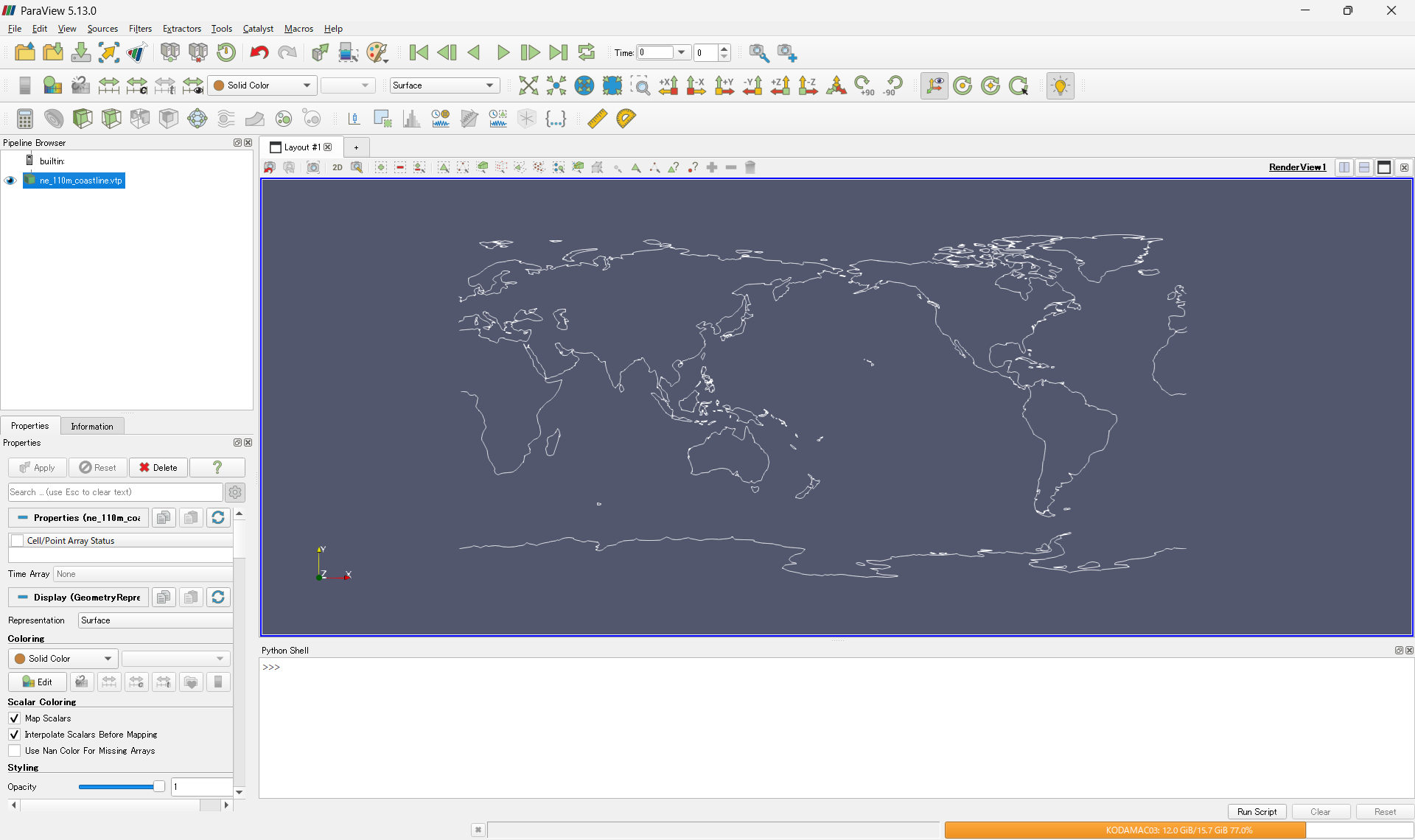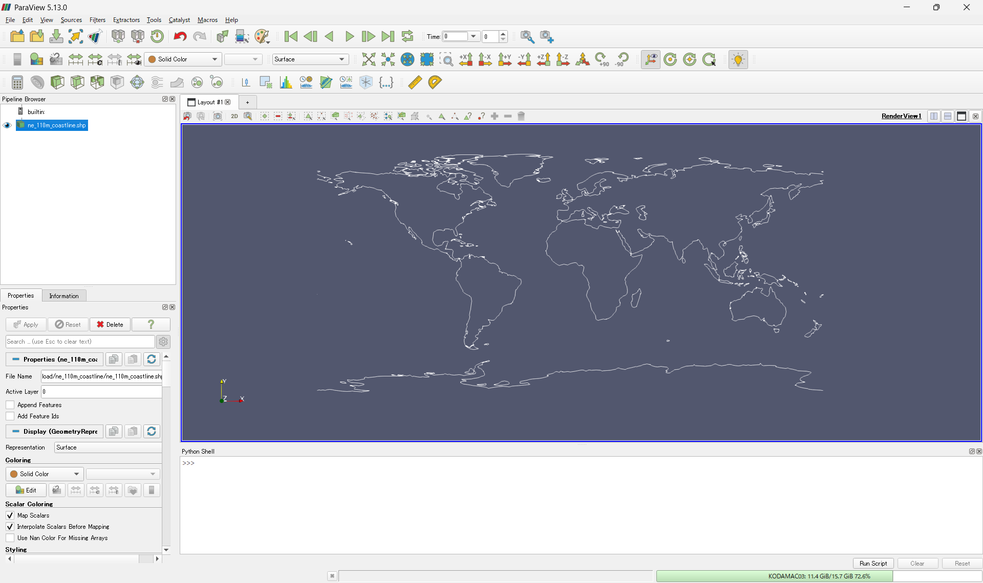 接続に成功すれば以後、通常とほぼ同様に ParaView を利用することができる。なお、ファイルの Open などではサーバ側のファイルを操作することになるが、python スクリプトはクライアント側のファイルを読み込むことも可能である。